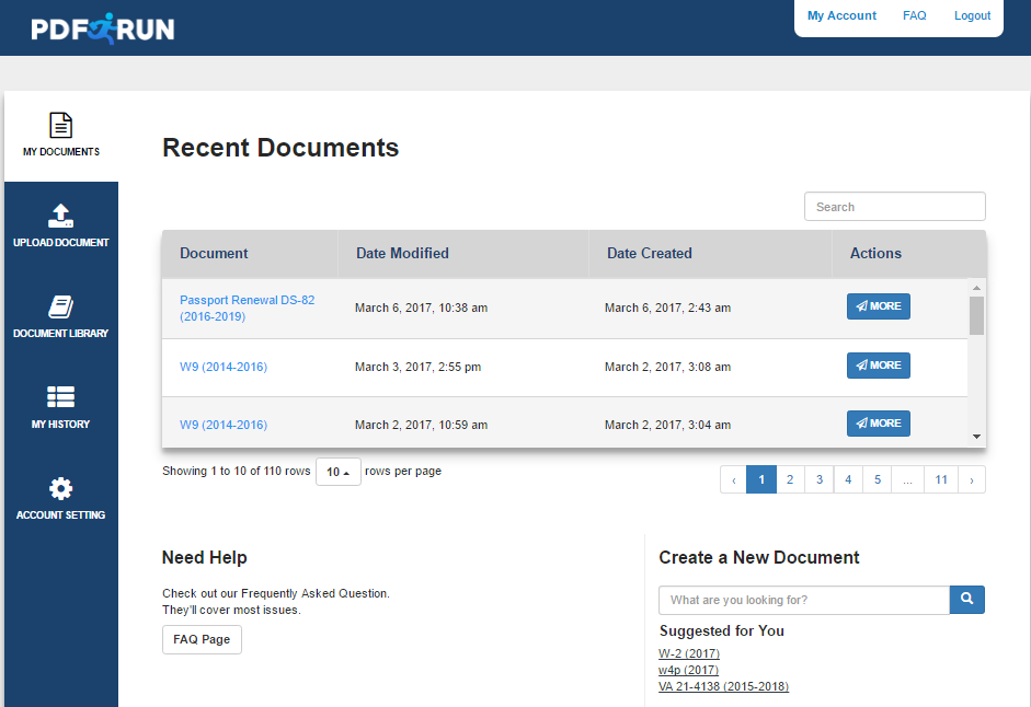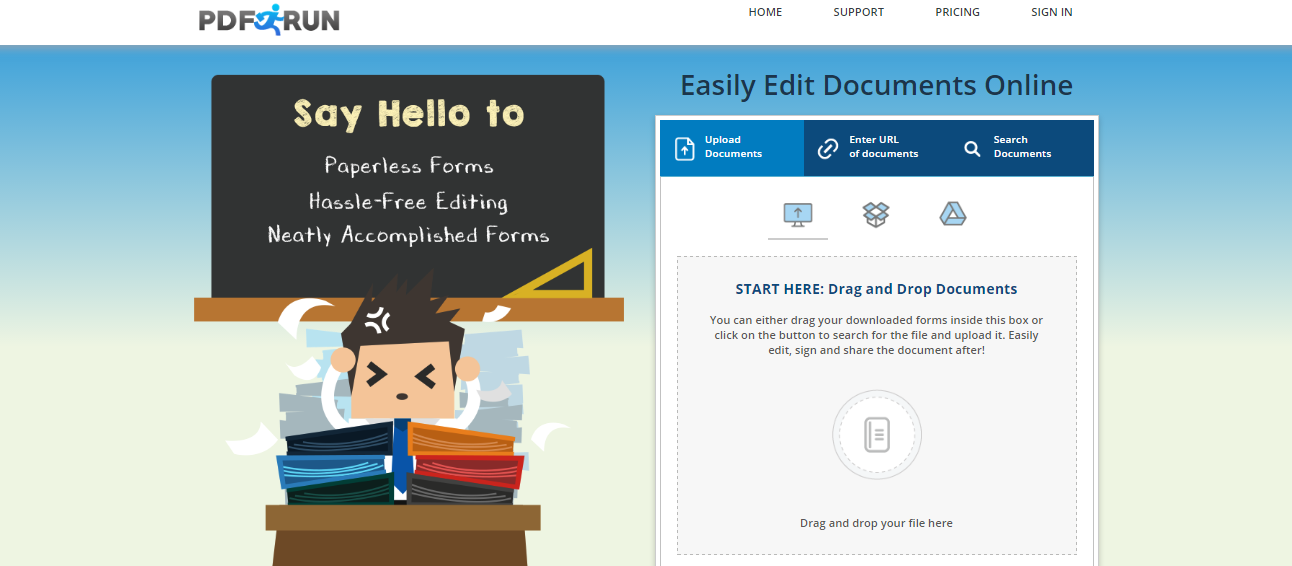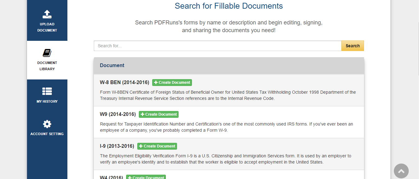 PDFRun allows you to either upload your document or choose from a selection of templates available. You can choose forms on https://www.pdfrun.com/form